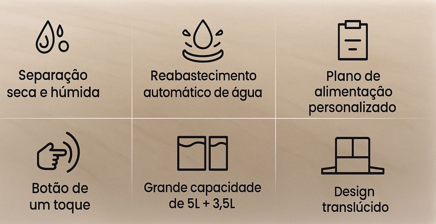 - Separação seco e húmido: Mantém a ração protegida e a água sempre fresca.